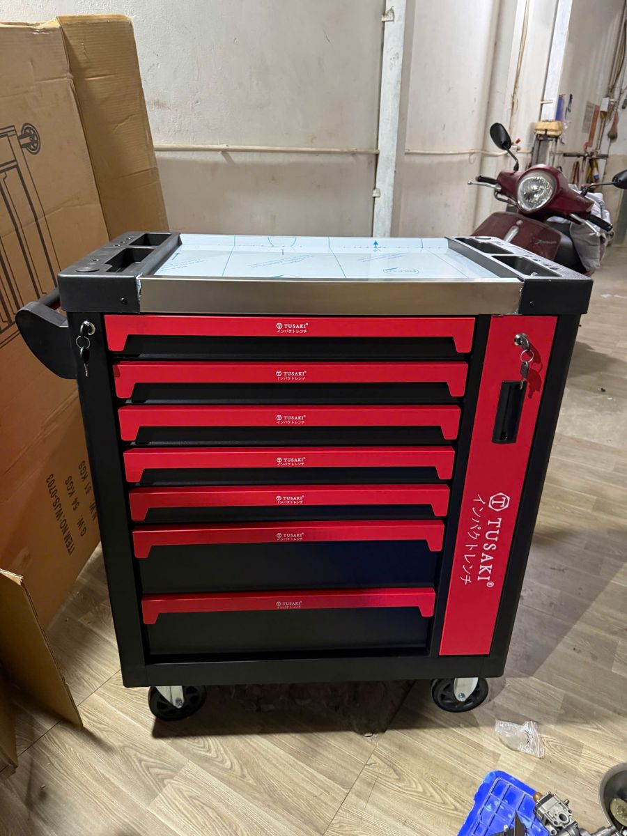 Tủ đựng đồ nghề 8 ngăn TUSAKI là mẫu tủ chuyên dụng cho garage sửa chữa ô tô – xe máy và xưởng cơ khí. Với thiết kế 8 ngăn kéo phân chia khoa học, tủ giúp thợ kỹ thuật sắp xếp dụng cụ gọn gàng, dễ tìm, tiết kiệm tối đa thời gian làm việc.